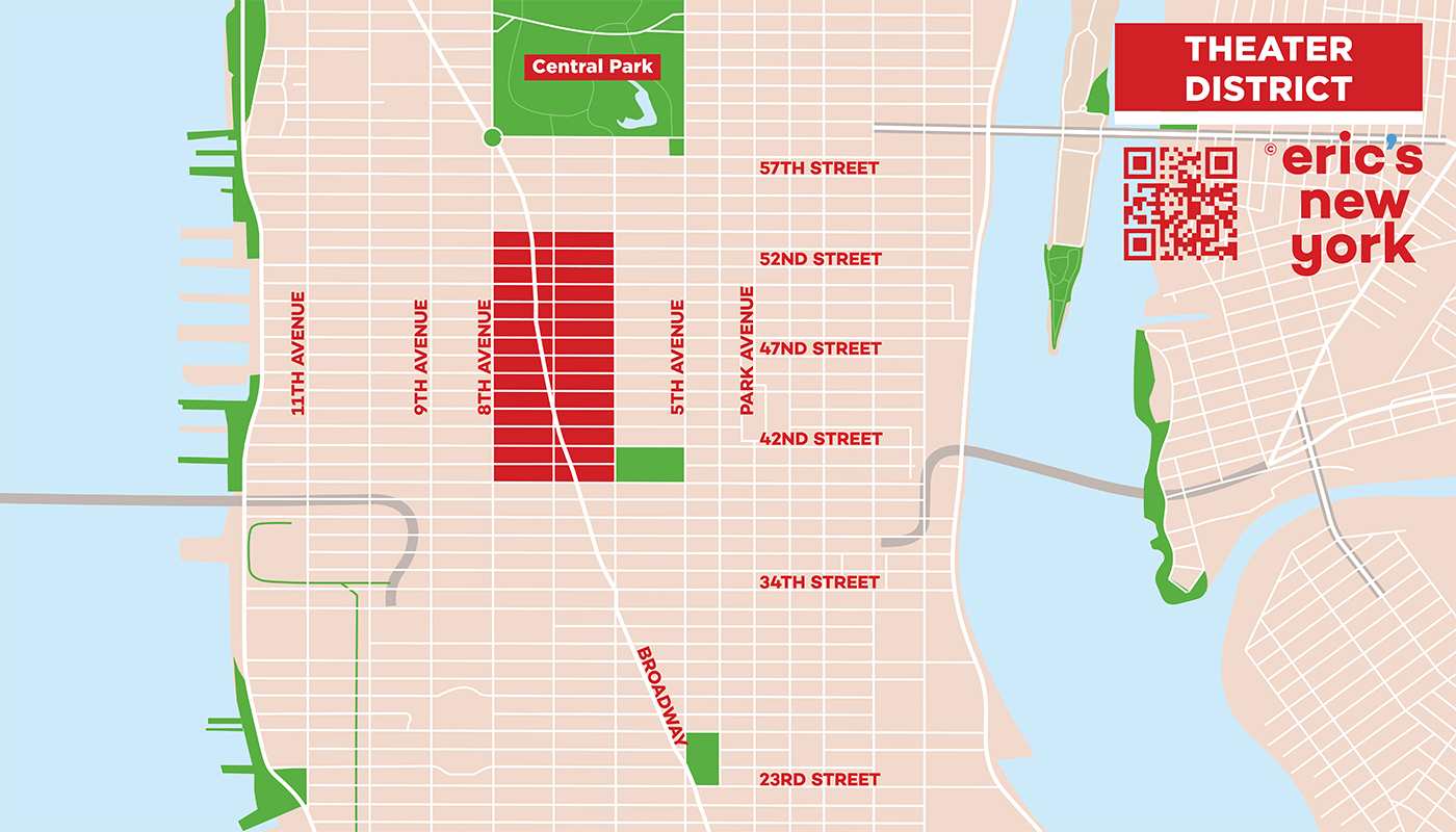Theater District en Nueva York es el principal núcleo de entretenimiento de la ciudad! El Theater District se extiende desde West 40th Street hasta West 54th Street, y desde West 6th Avenue hasta East 8th Avenue. Broadway atraviesa este distrito y la icónica Times Square forma parte de él. Sin duda alguna, es en este área donde se genera la intensa vitalidad de Nueva York. Muchos de los teatros de Nueva York se pueden encontrar en esta parte de Manhattan. Además de shows de Broadway, encontrarás muchas otras cosas que ver y hacer en Theatre District.